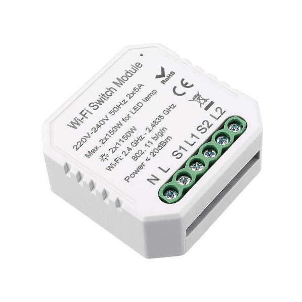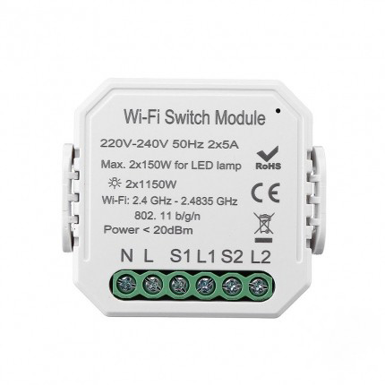این ماژول هوشمند در زمان جریانات ناخواسته برق از دستگاه متصل به خود حفاظت می نماید. ماژول رله هوشمند دو پل WiFi را می توان برای اتصال و یا قطع جریان برق به صورت هوشمند برای هر وسیله برقی استفاده نمود (On/Off). البته به این نکته باید دقت نمود که این ماژول قادر به پشتیبانی از ۵ آمپر خروجی به ازای هر پل آن میباشد. این ماژول بدون نیاز به سرور مرکزی بصورت مستقیم به مودم وای فای متصل شده و به راحتی با چند کلیک به اپلیکیشن خانه هوشمند اضافه می گردد.