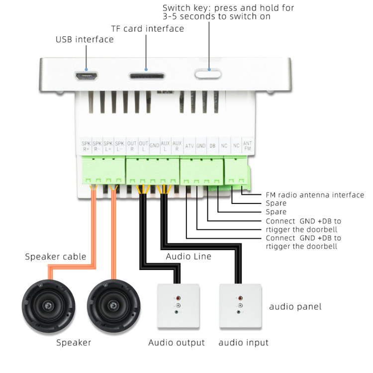 توضیحات: پنل صوتی دیواری، ورودی های USB و SDکارت، بلوتوث، AUX ورودی، AUX خروجی، رادیو FM، ریموت کنترل IR، برق ورودی 220ولت AC