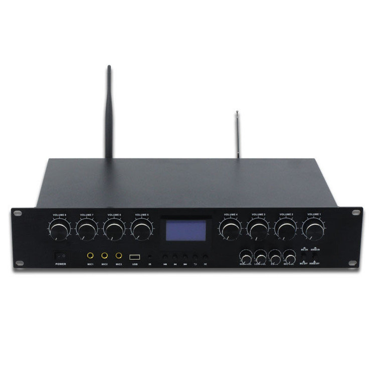 توضیحات: آمپلی فایر تمام اهمی دارای صفحه نمایشگر، دارای 8 کلید ولوم جهت کنترل هر یک از خروجی ها، ورودی USB، بلوتوث، رادیو FM، دو درگاه ورودی AUX، خروجی AUX، سه ورودی میکروفن با کلید های کنترلی میکروفن ها، ریموت کنترل IR، ورودی برق 220 ولت AC